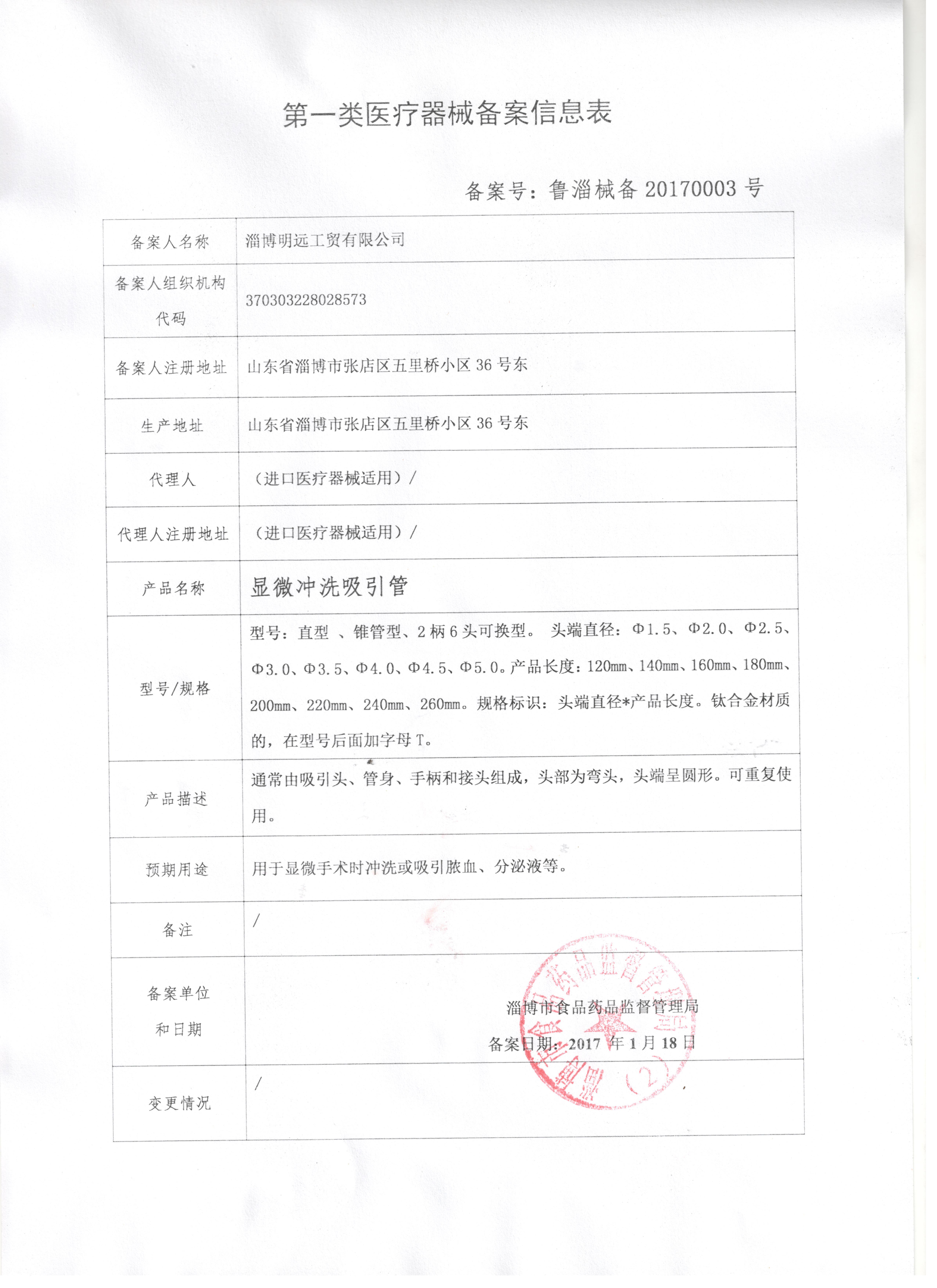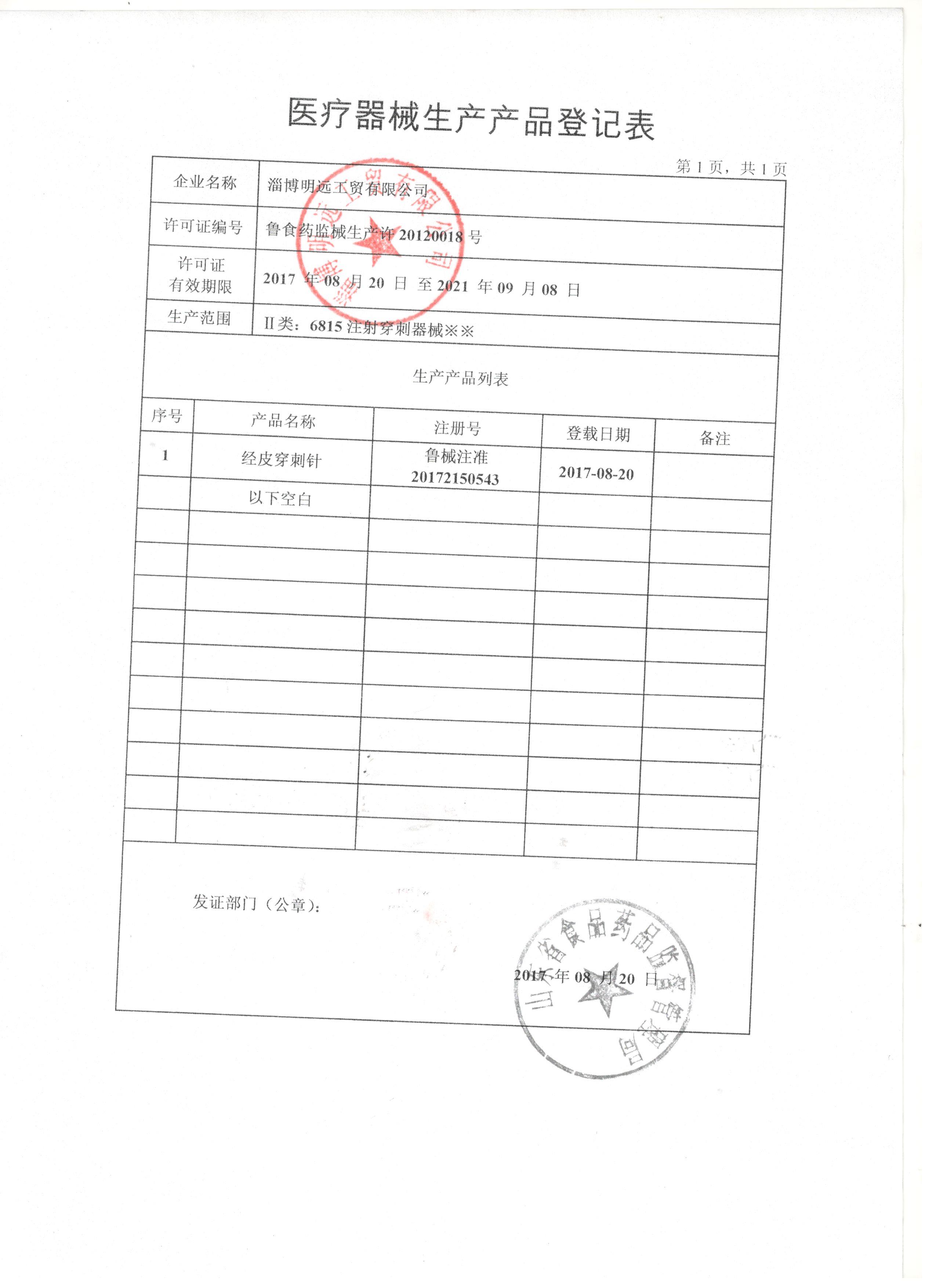 淄博明遠(yuǎn)工貿(mào)有限公司 公司成立于2000年,是二類醫(yī)用穿刺器械專業(yè)生產(chǎn)廠家。公司以微創(chuàng)手術(shù)器械為發(fā)展方向,產(chǎn)品以各類特種穿刺針為主。我們以全方位的管理手段,嚴(yán)格地控制產(chǎn)品品質(zhì).歡迎您選用我公司產(chǎn)品并對(duì)我們的產(chǎn)品提出建設(shè)性的建議和意見.我們?cè)敢獬蔀槟玫纳饣锇楹椭呐笥选?